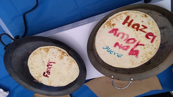 Frases diversas fueron plasmadas con colores vegetales comestibles, en las tortillas que los mismos jóvenes elaboraron a partir de los testales de masa, manejando con total habilidad el rodillo o palote, para luego ser remitidas al comal, y posteriormente recibir alguno de los sabrosos guisados para relleno como carne en rojo, chicharrón en verde y frijoles con queso. El papel de envoltura también portó mensaje.