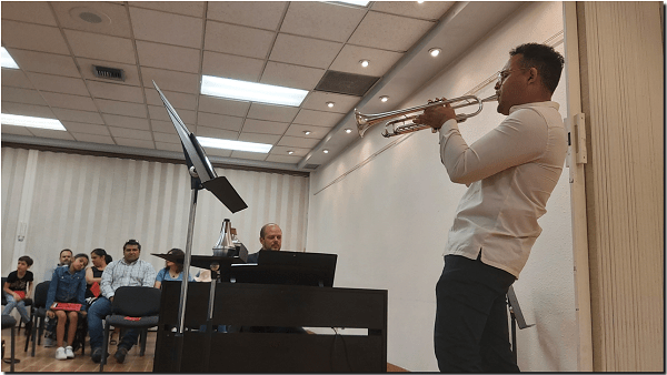 Para mayor goce del público, la pieza fue tocada en versión larga, y no como el resto del programa en que de una obra fueron interpretados uno o dos movimientos. En la trompeta, el ejecutante hizo uso del aditamento conocido como sordina, que da un timbre particular al sonido del instrumento.