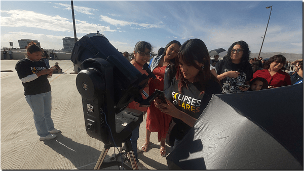 Con otro telescopio fue posible tomar imágenes en el celular –eclipse para llevar– para que las personas se llevaran un recuerdo en su dispositivo. Aqui fue necesario el auxilio de los jóvenes universitarios, muy diligentes en todo momento.