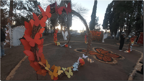 Es un altar colectivo decorado con la mariposa monarca, otro de los símbolos del Día de Muertos, ya que su migración finaliza en México en esta temporada.