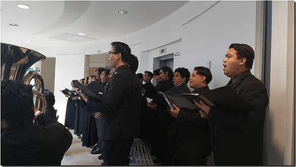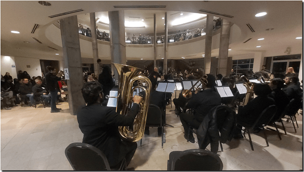 La orquesta se colocó en la parte norte del vestíbulo que tiene forma circular, y el numeroso público ocupó la parte sur y la segunda planta, alrededor del foso que da hacia el ventanal del techo.