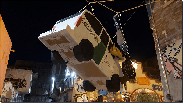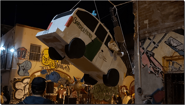 Niños, adolescentes y adultos se formaron para intentar romper alguna de las tres piñatas: una, tradicional en forma de estrella de siete puntas; otra, en forma de patrulla fronteriza (Border Patrol) con un perro y un coyote asomando por sus ventanillas y una Estatua de la Libertad en el capacete; la última en forma de una AKA47-cuerno de chivo.
