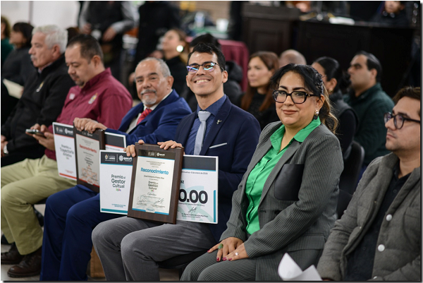 En la Sesión Ordinaria de Cabildo número 8, efectuada este día, se entregaron los premios a la Trayectoria Artística y al Gestor Cultural a Joel Pérez Gutiérrez y José Roberto Prieto Díaz, respectivamente, los cuales son otorgados por el Instituto para la Cultura del Municipio de Juárez (IPACULT) y la Comisión Edilicia de Cultura.