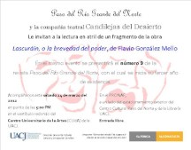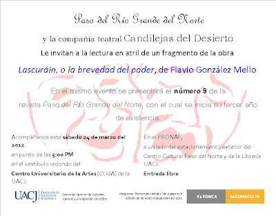Ya está en puerta la presentación del número 9 de la revista Paso del Río Grande del Norte y con este número llegamos al tercer año de su publicación. Reciban la invitación para que nos acompañen el próximo sábado 24 de marzo, a las 5 de la tarde, en el CUDA (Centro Universitario de las Artes) -a un lado del Centro Cultural Paso del Norte-.